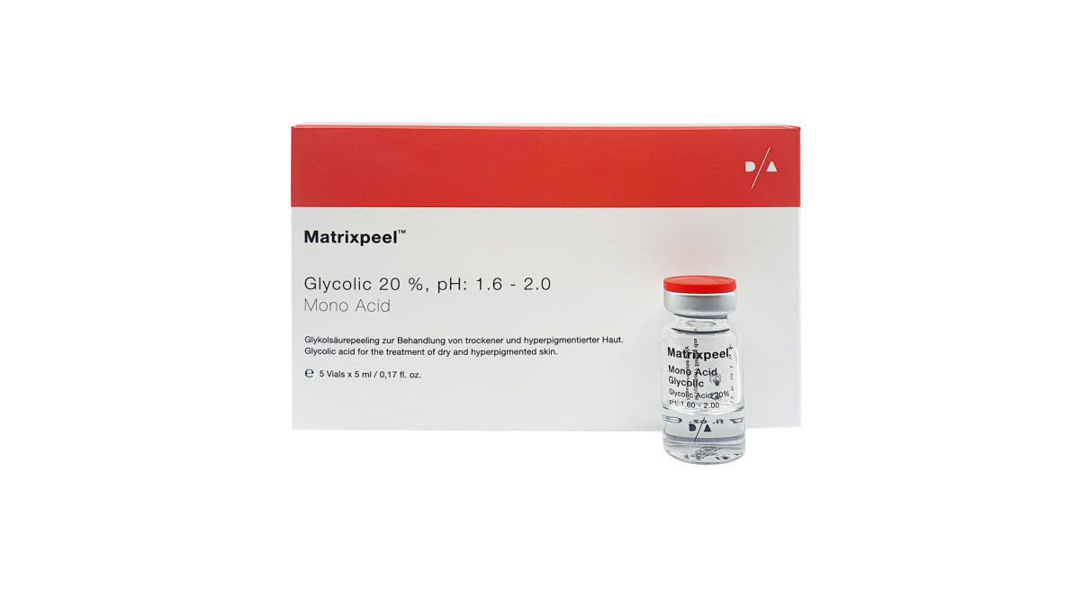 DERMIDA Matrixpeel™ Glycolic 20% Mono Acid je chemický peeling na báze kyseliny glykolovej na ošetrenie hyperpigmentácie, nečistej pleti, pupienkov, opticky veľkých pórov alebo unavenej, suchej a bledej pleti. Vďaka svojmu viskóznemu zloženiu a hodnote pH 1,6 až 2,0 sa ideálne hodí na aplikáciu ihlovacím perom v kombinácii s nano hlavicou ihly. Na tento účel sa sterilný a farmaceuticky čistý peeling nanáša štetcom pred ošetrením a následne sa lokálne zapracuje do pokožky pomocou Dermapenu a hlavice nano ihly. Týmto spôsobom možno výrazne zvýšiť účinnosť glykolového peelingu.