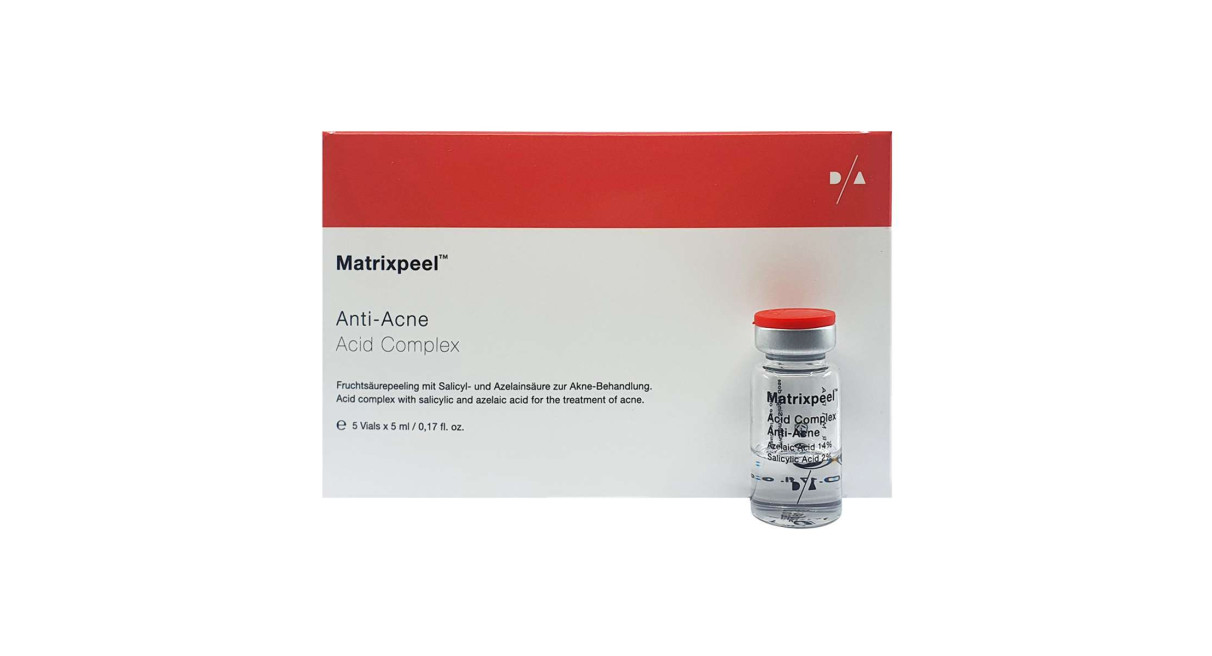 Chemický peeling na akné, mastnú pleť, komedóny a jazvy po akné. DERMIDA® Matrixpeel™ je komplex chemických kyselín s kyselinou azelaovou (14%) a kyselinou salicylovou (2%) na regresiu akné, mastnej pleti, komedónov, čiernych bodiek a jaziev po akné. K tomu šetrne odstraňuje odumreté kožné bunky, reguluje obsah mazu v pokožke, minimalizuje rozšírené póry a vyrovnáva rôzne tóny pleti.